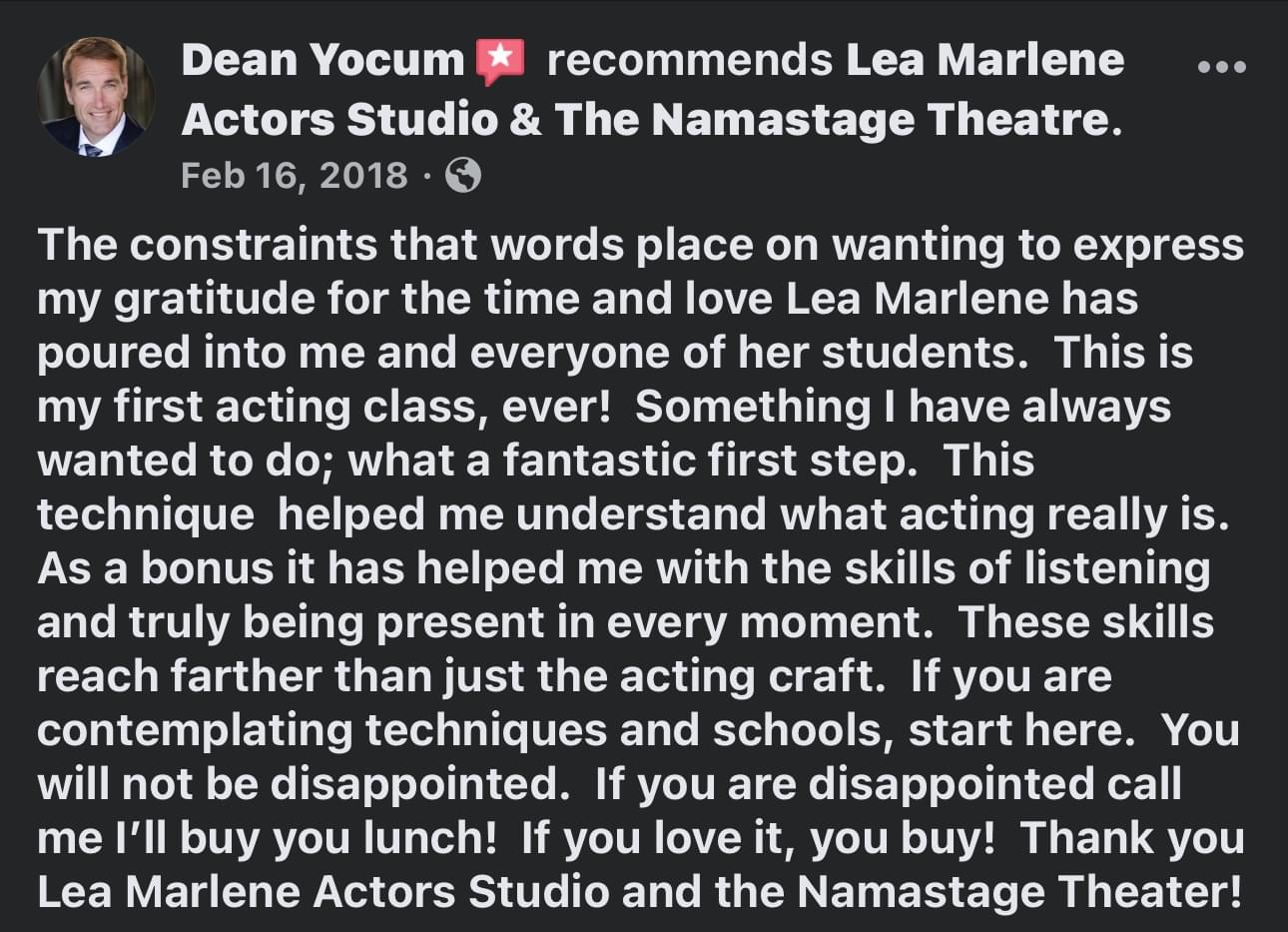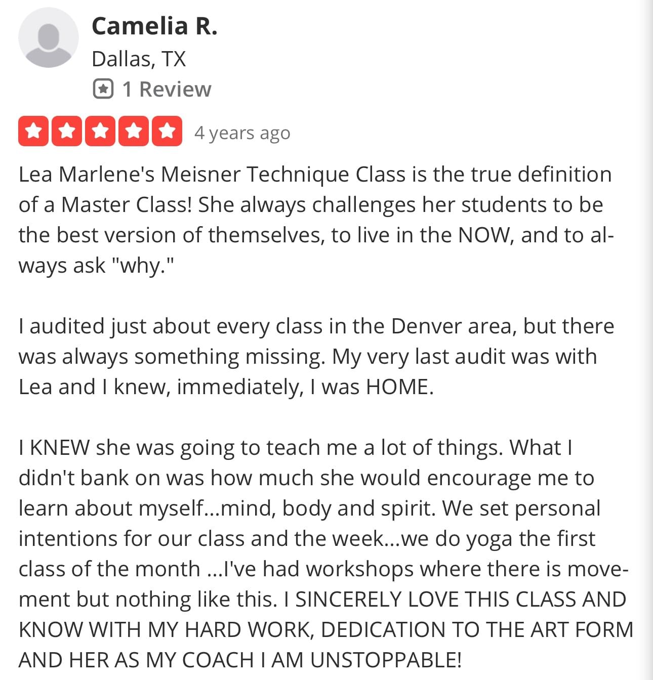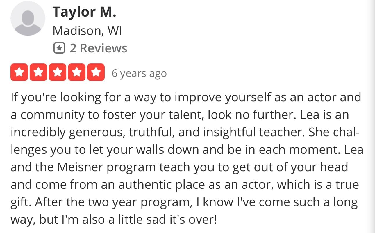 A: If you want deeper connections, a stronger imagination, solution set, to have more fun, build a business, write a script, help your clients, and or, you have to get on stage, and or, on camera, for any reason, Lea without a doubt can help you! Working with Lea has helped many non actors including; Lawyers, Doctors, Restauranteurs, Therapists, Social Workers, Realtors, Content Creators, Influencers, Life Coaches and more! That's because this work and the tools she will give you, go much deeper than any other run of the mill acting class or coaching program.
