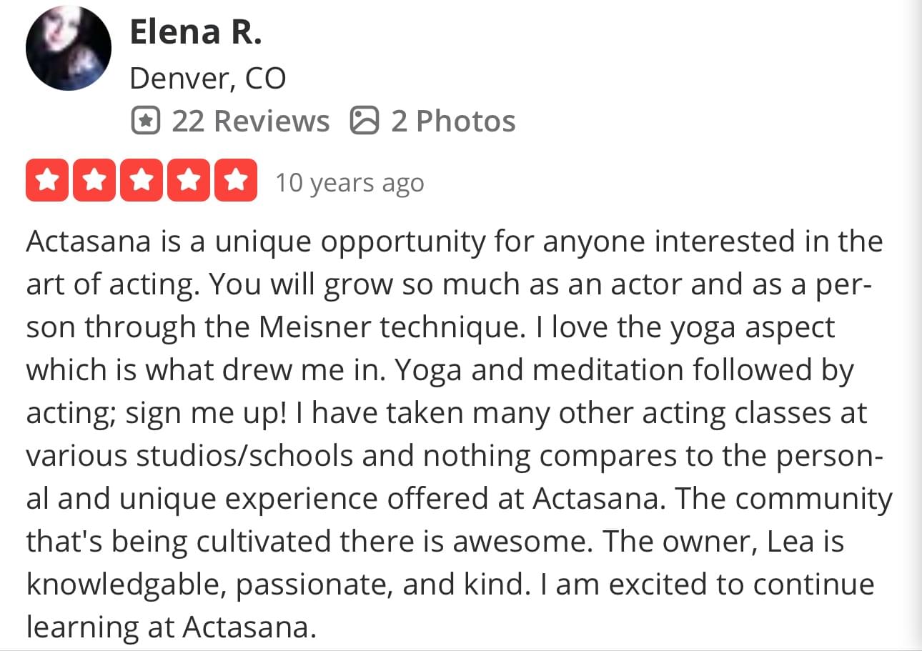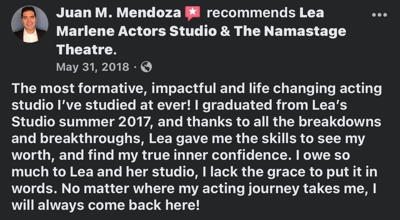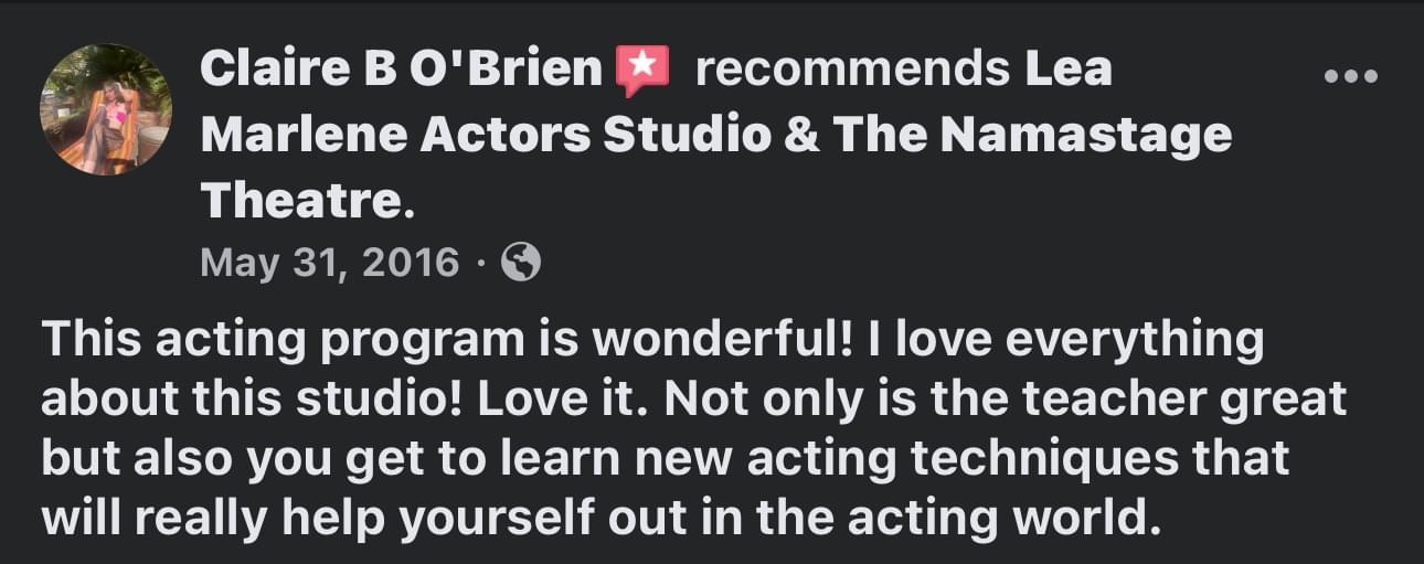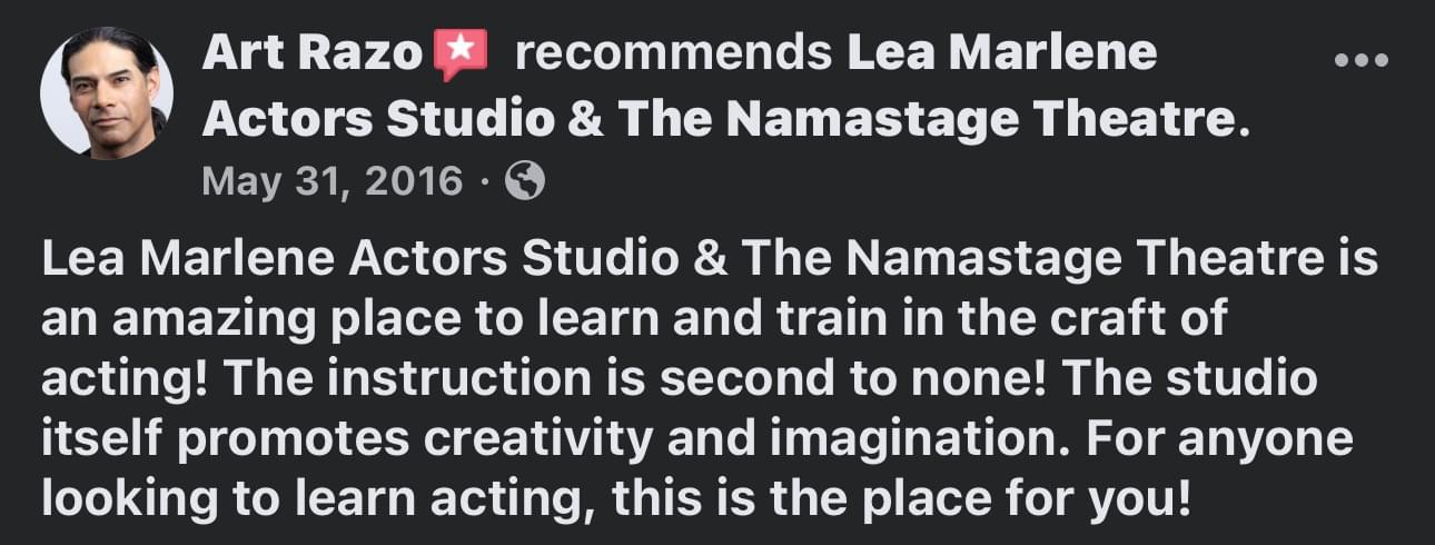 A: If you want deeper connections, a stronger imagination, solution set, to have more fun, build a business, write a script, help your clients, and or, you have to get on stage, and or, on camera, for any reason, Lea without a doubt can help you! Working with Lea has helped many non actors including; Lawyers, Doctors, Restauranteurs, Therapists, Social Workers, Realtors, Content Creators, Influencers, Life Coaches and more! That's because this work and the tools she will give you, go much deeper than any other run of the mill acting class or coaching program.